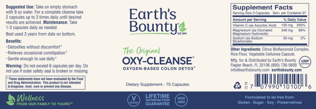 I was introduced to Oxy-Cleanse by a nutritionist many years ago. I am loyal to this product and this company ever since. Earth’s Bounty has been consistent with ordering and delivery….5 stars. The product itself is everything it claims to be…exceptional for colon health.