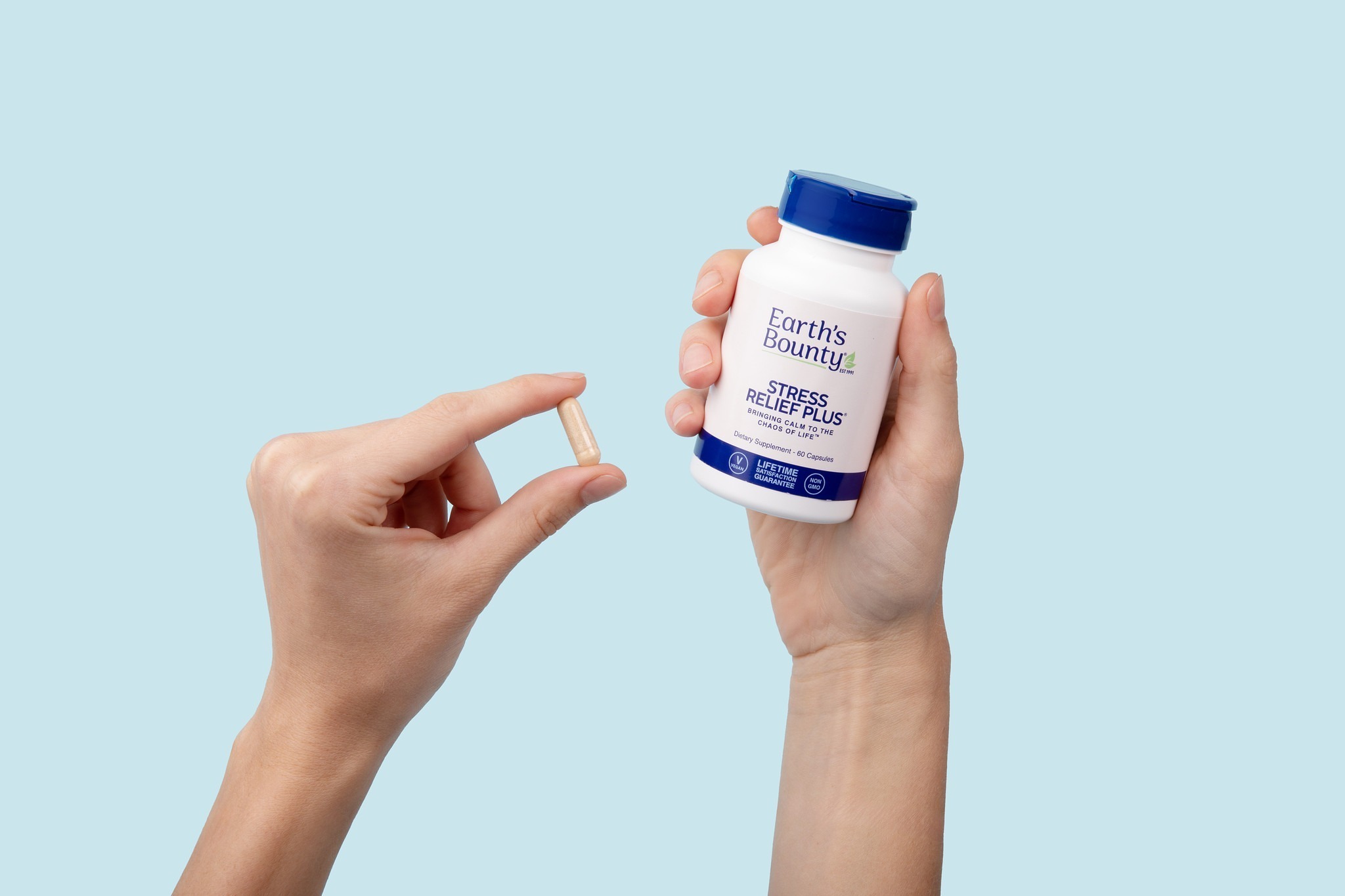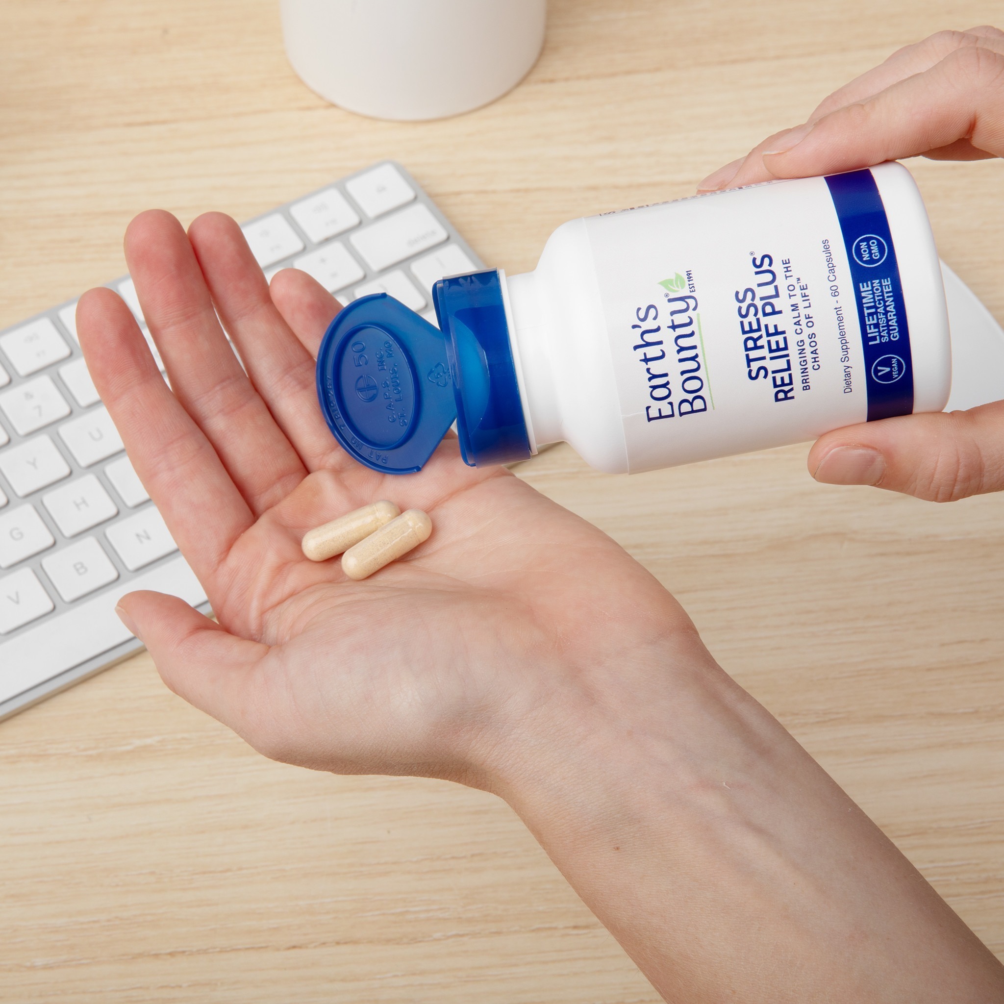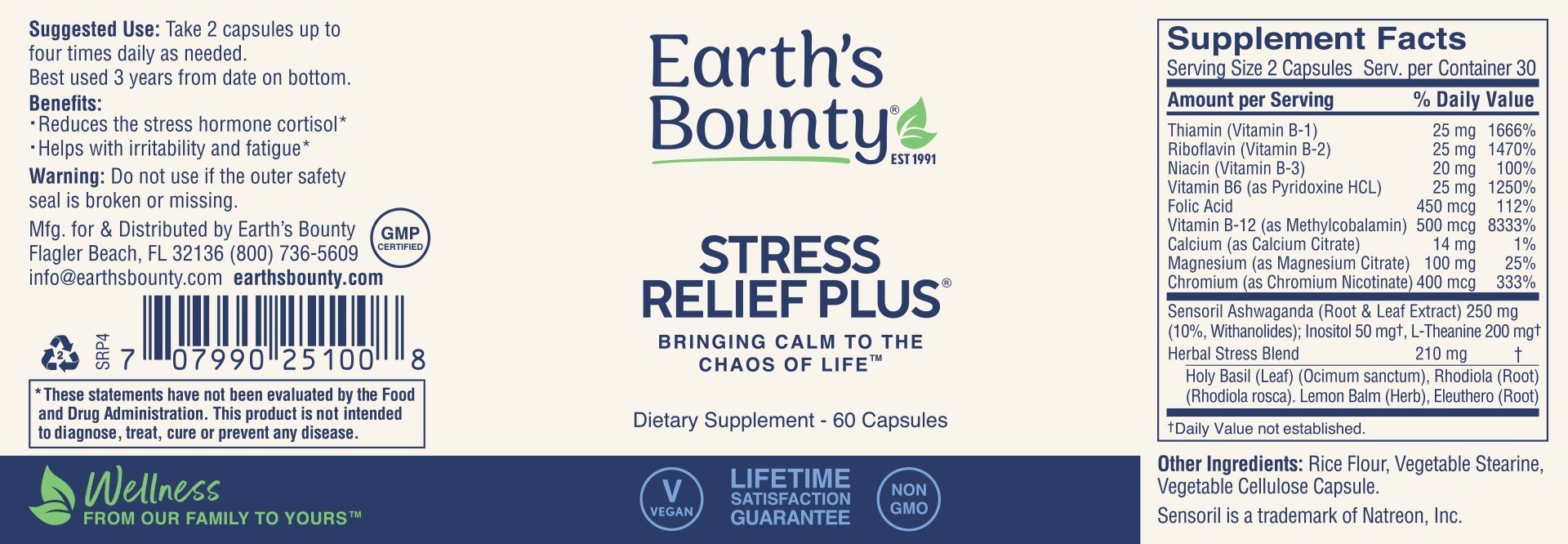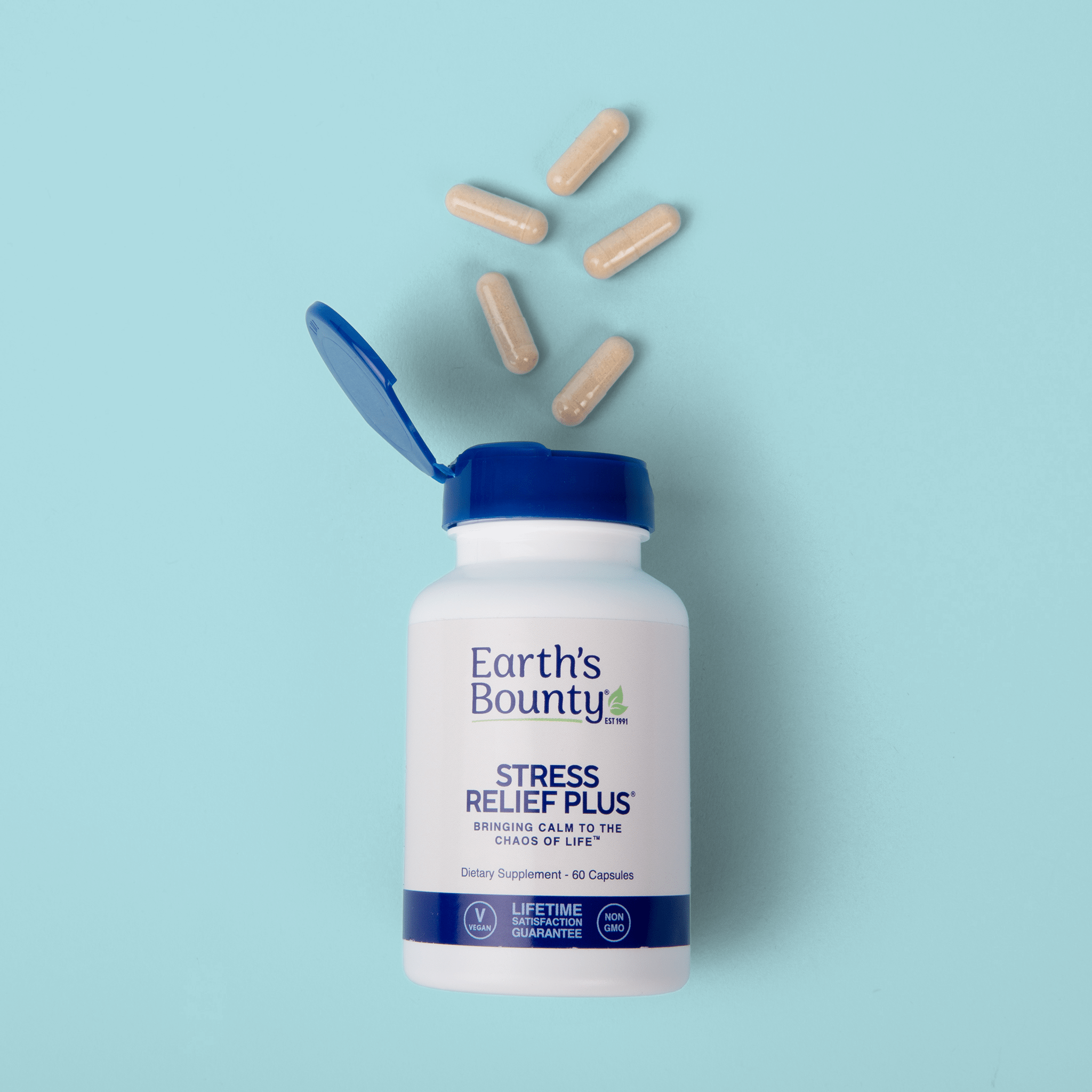 Stress has many physical and mental symptoms. Stress Relief Plus from Earth’s Bounty is a calming aid that helps counter stress in three specific ways, so you can feel happier in mind, body, and spirit.
